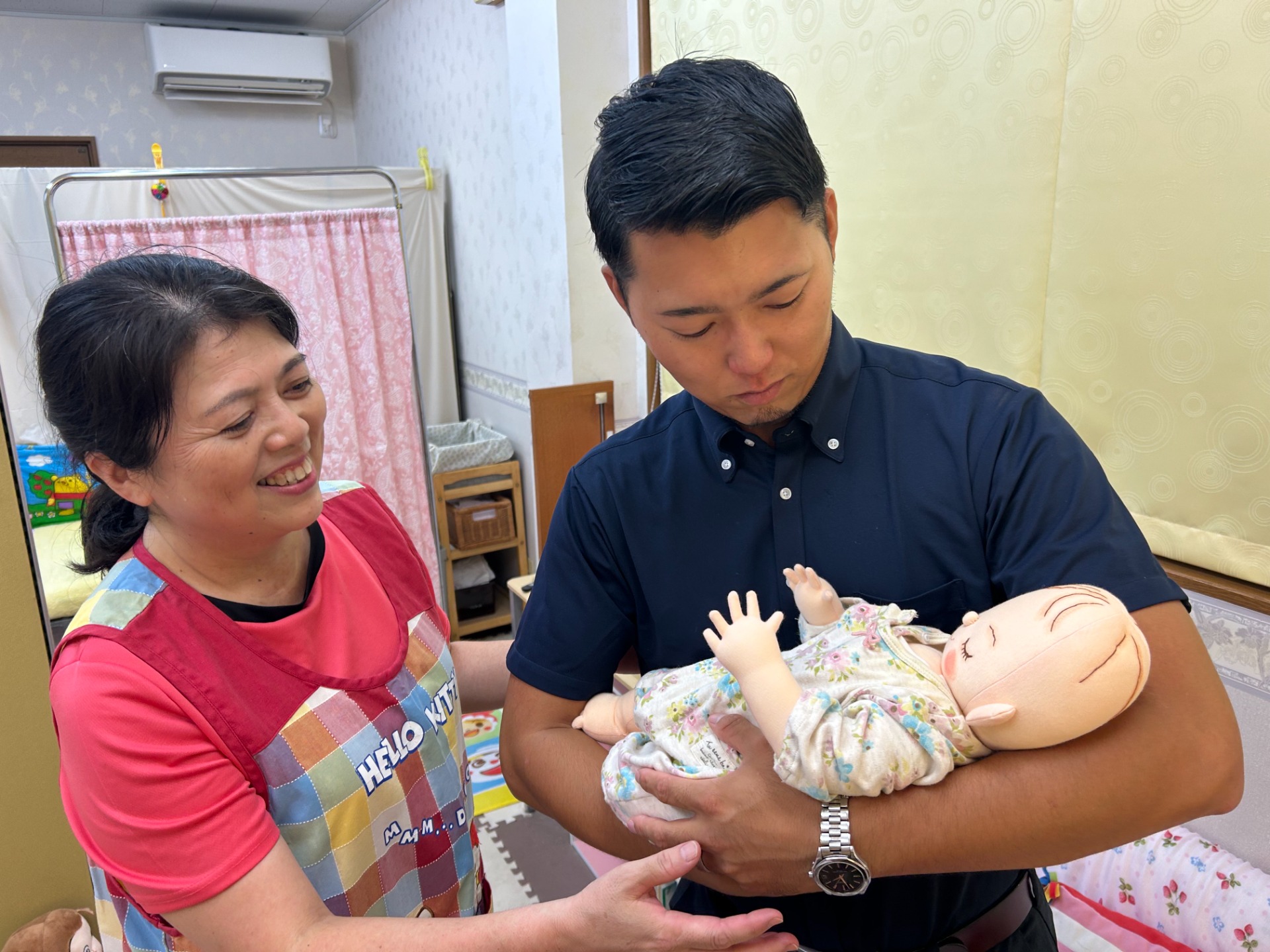 新生児サイズのお人形を使って、基本的な赤ちゃんのお世話(抱き方•オムツ交換•お着替え)について練習します。